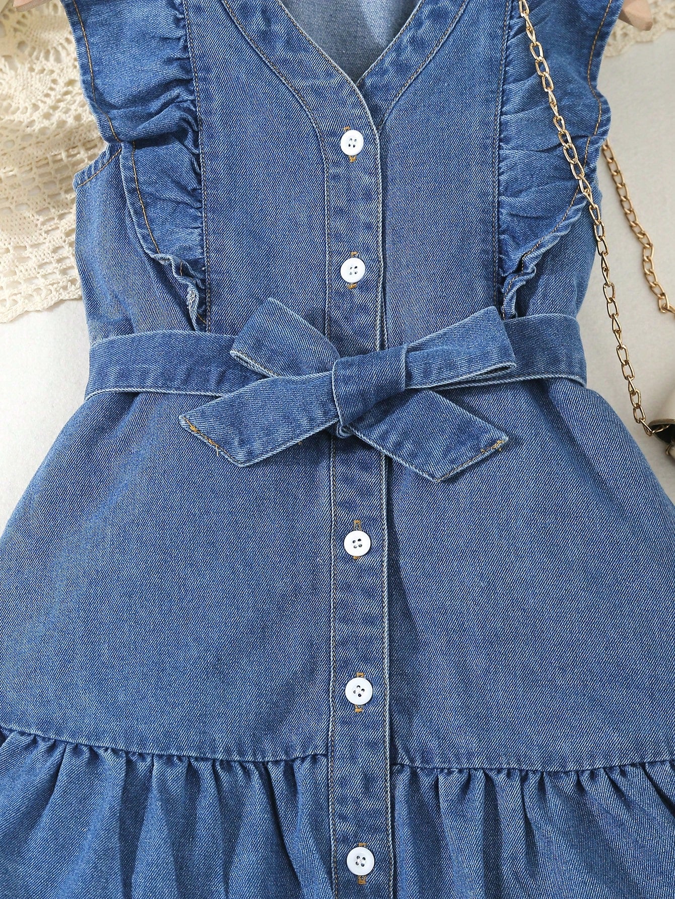 SHEIN Vintaside Kids Vestido de mezclilla de lavado medio azul con mangas con gorra y cinturón de cintura, estilo de vacaciones para niñas jóvenes
