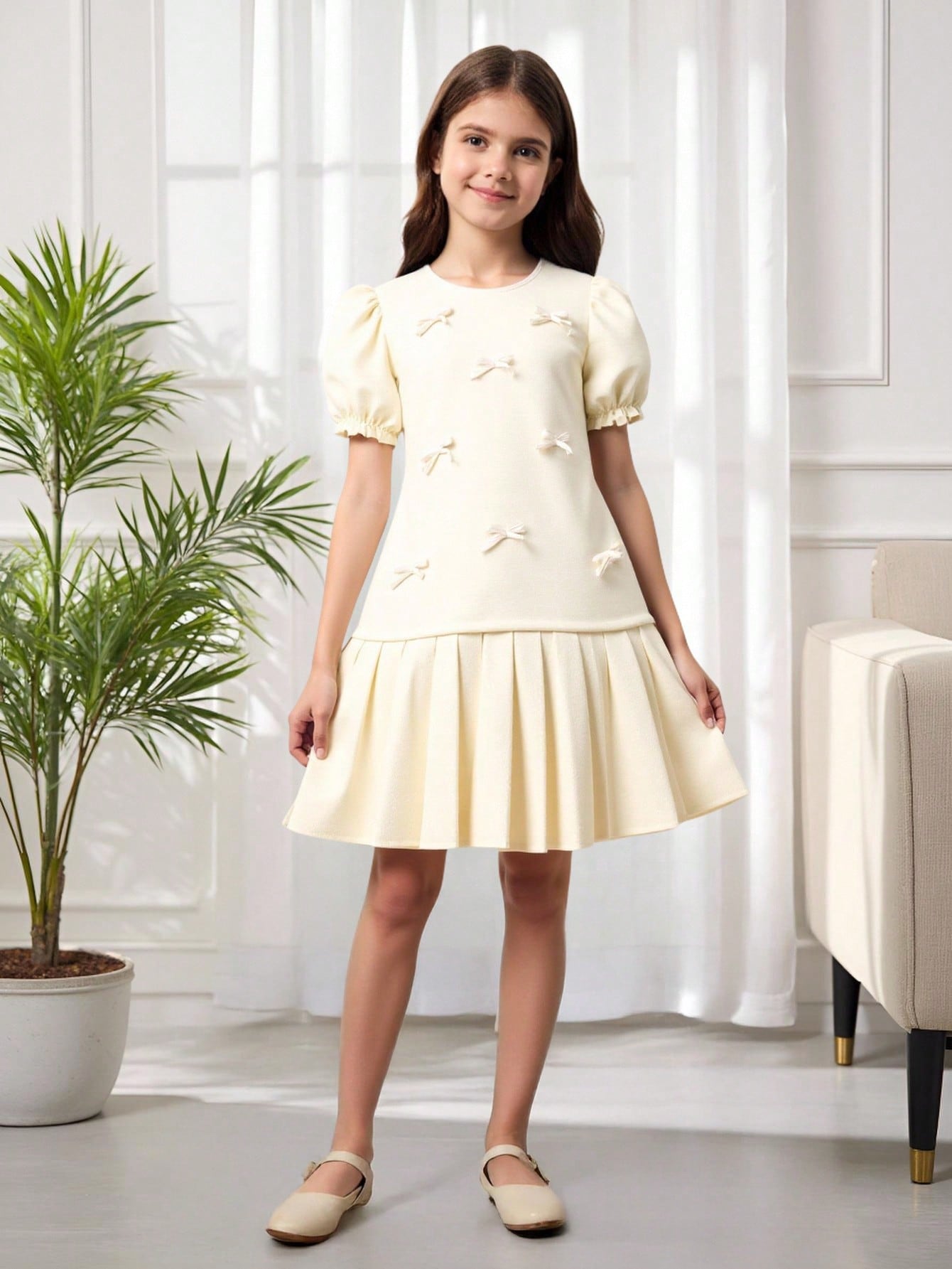 Vestido corto de manga corta con adorno de lazo de tela con textura, falda plisada elegante y lindo, para primavera/verano