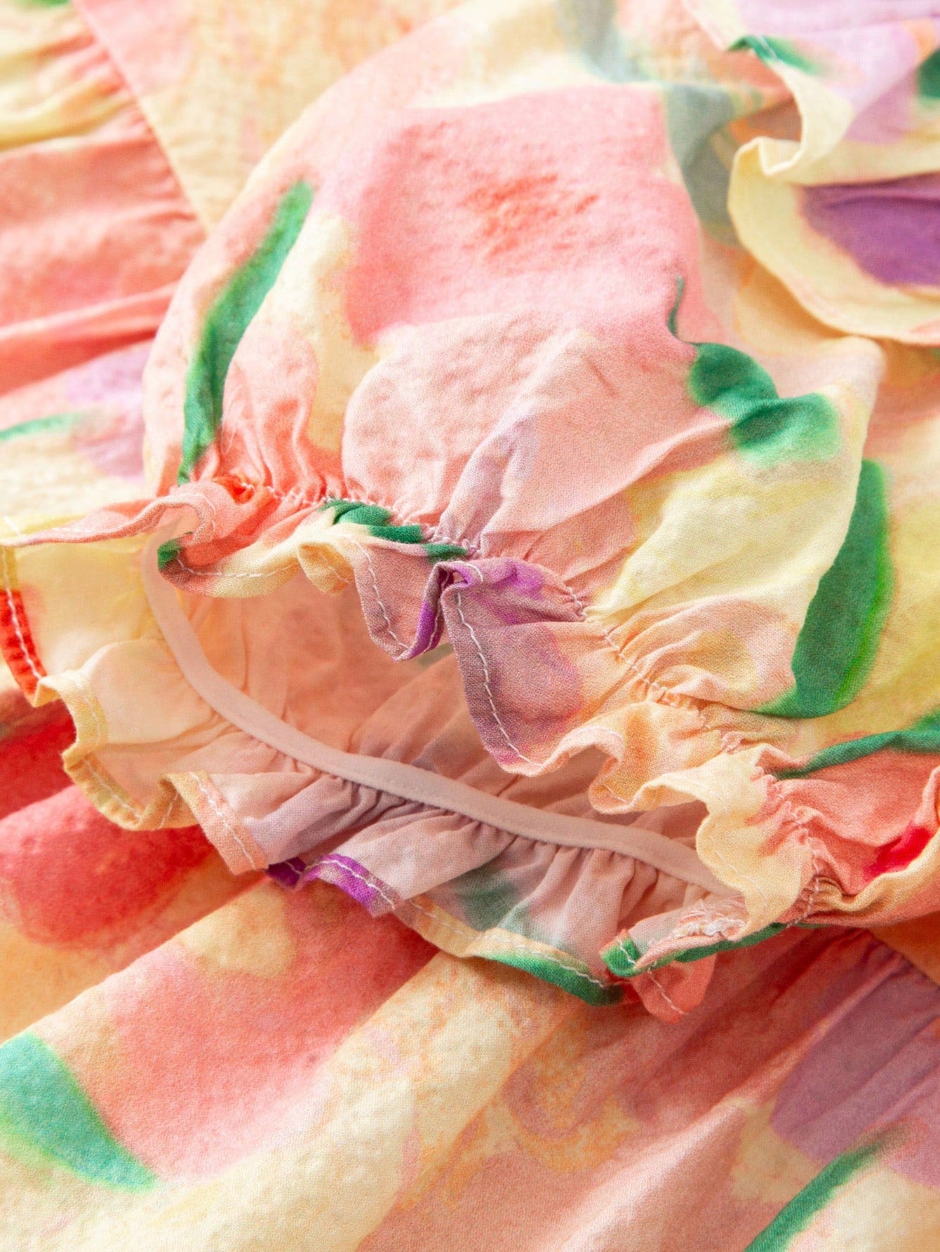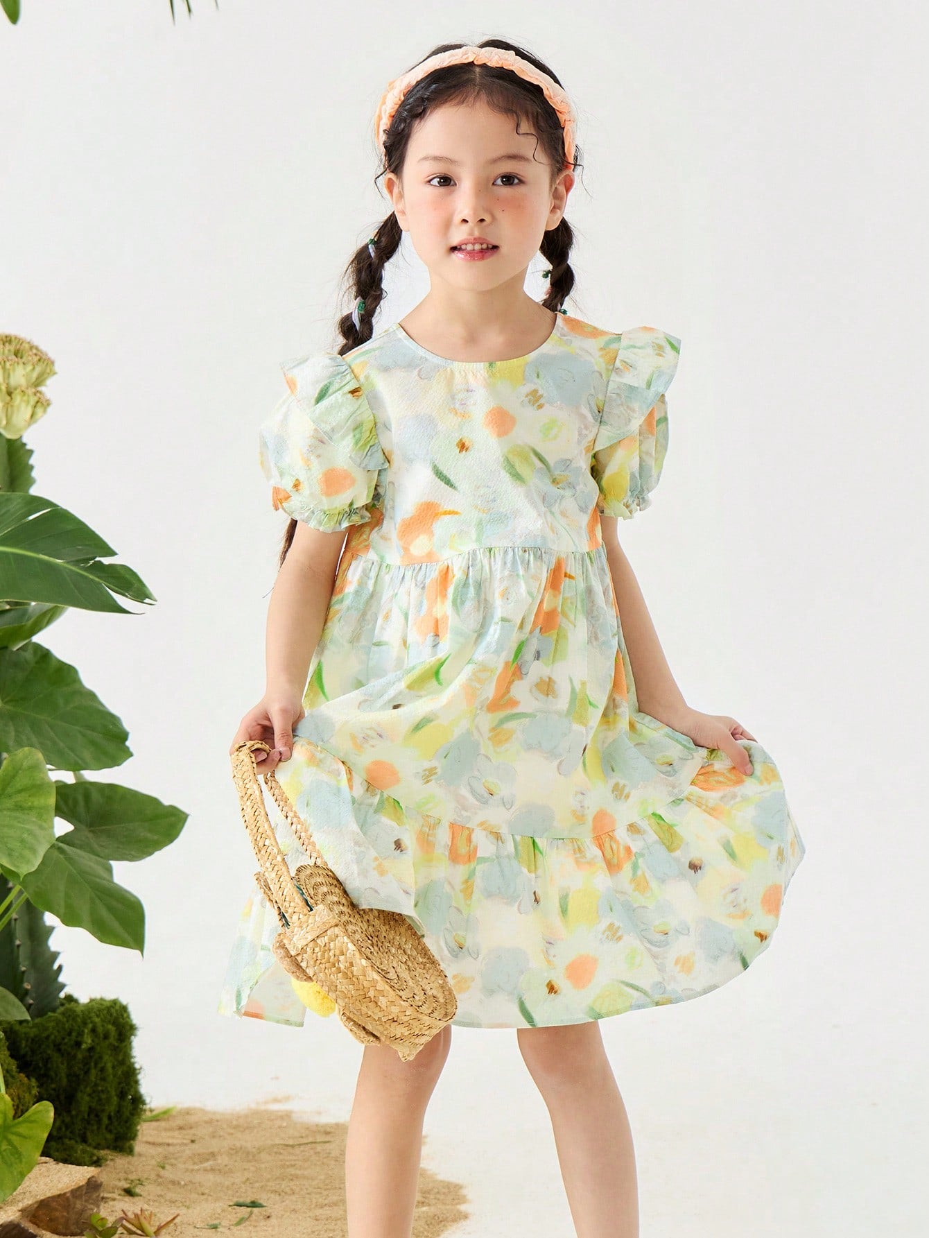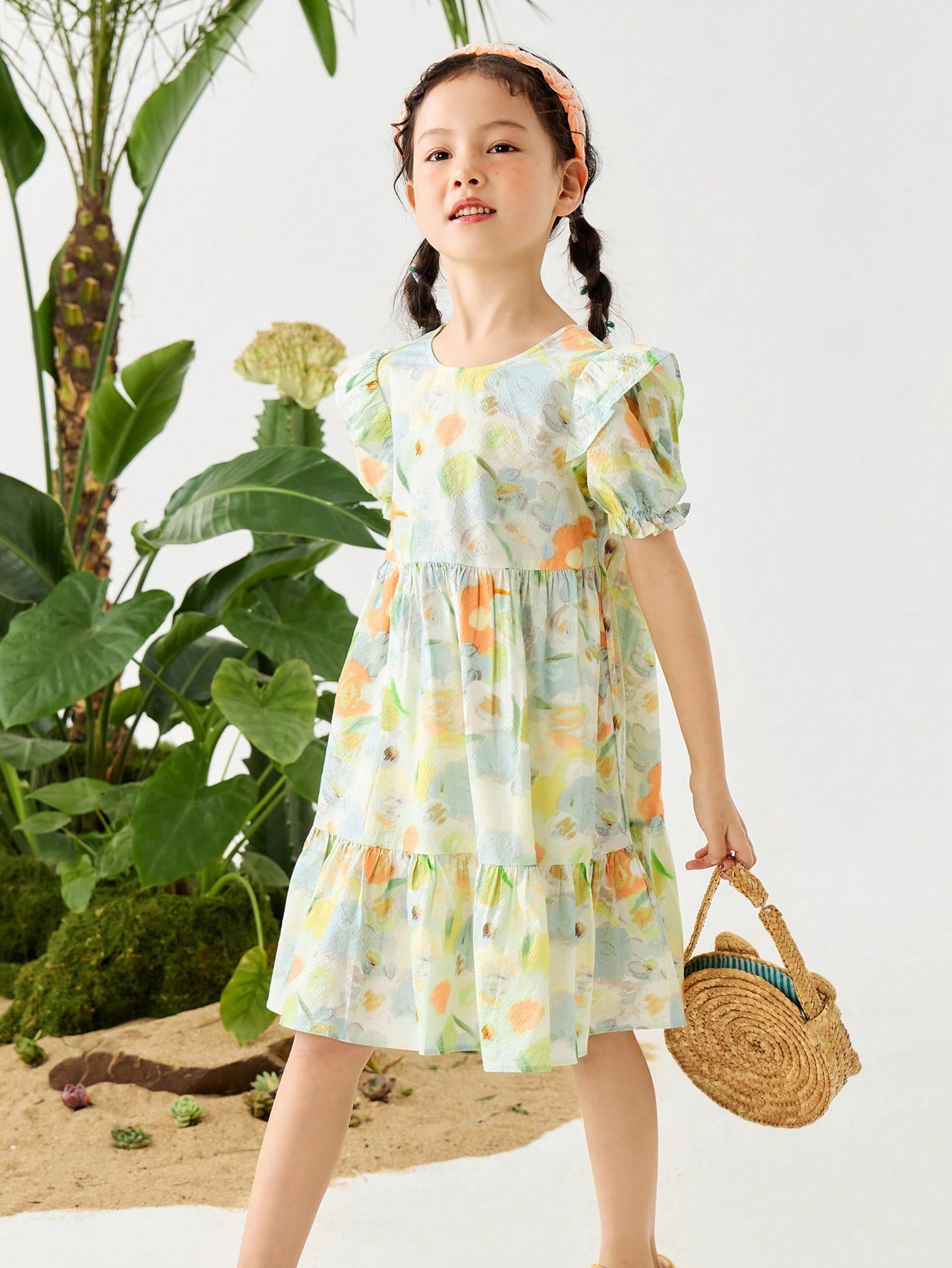 Vestido colorido de manga corta con mangas globo suave y transpirable para niñas