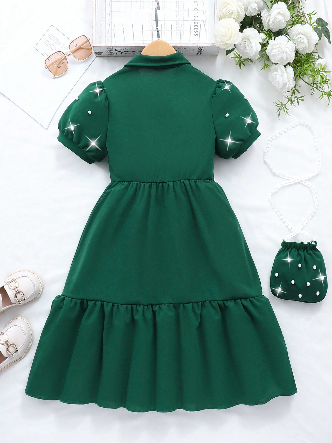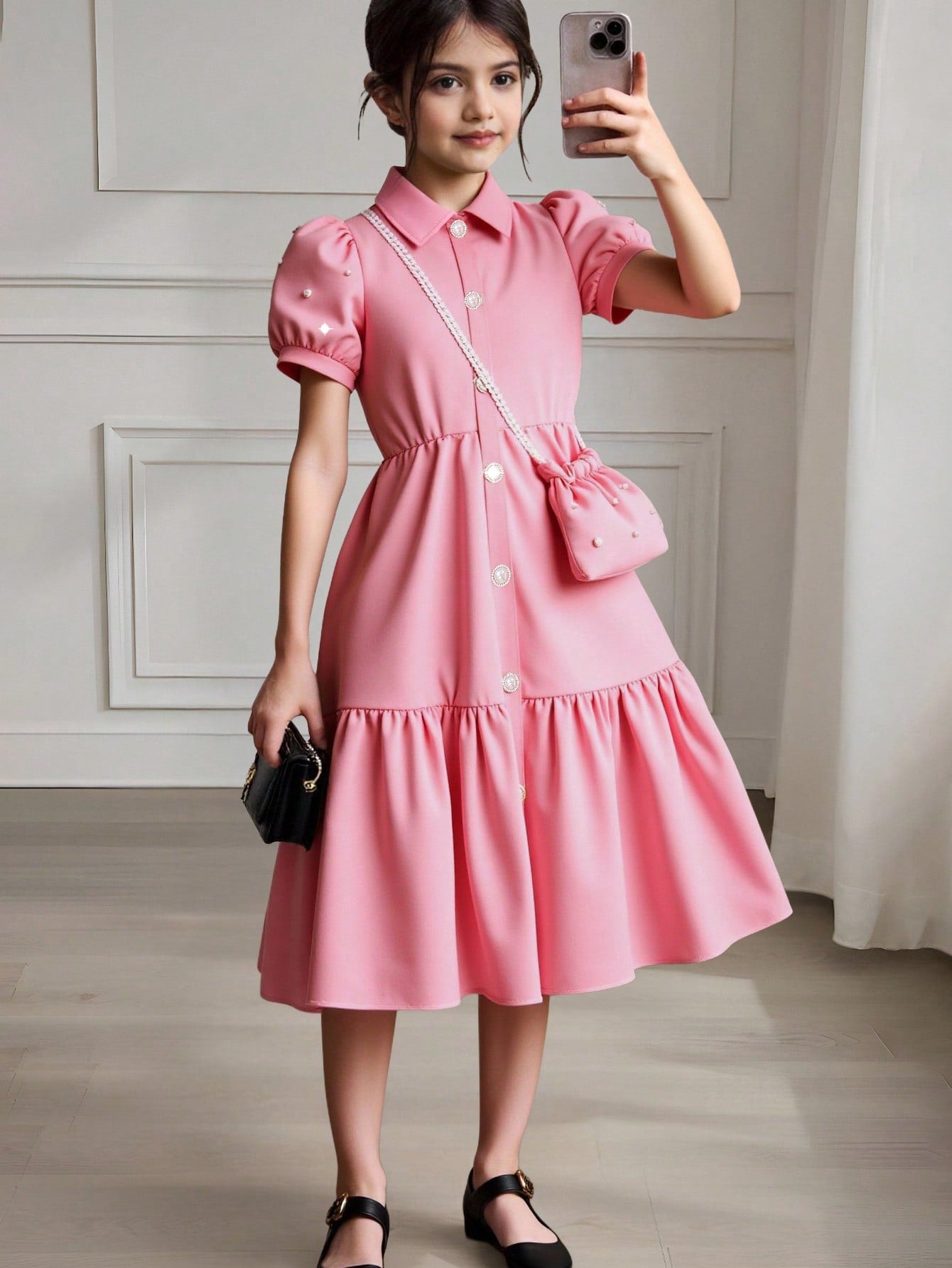 Vestido con chaqueta de manga abullonada, cuello y bolsillo, en unicolor