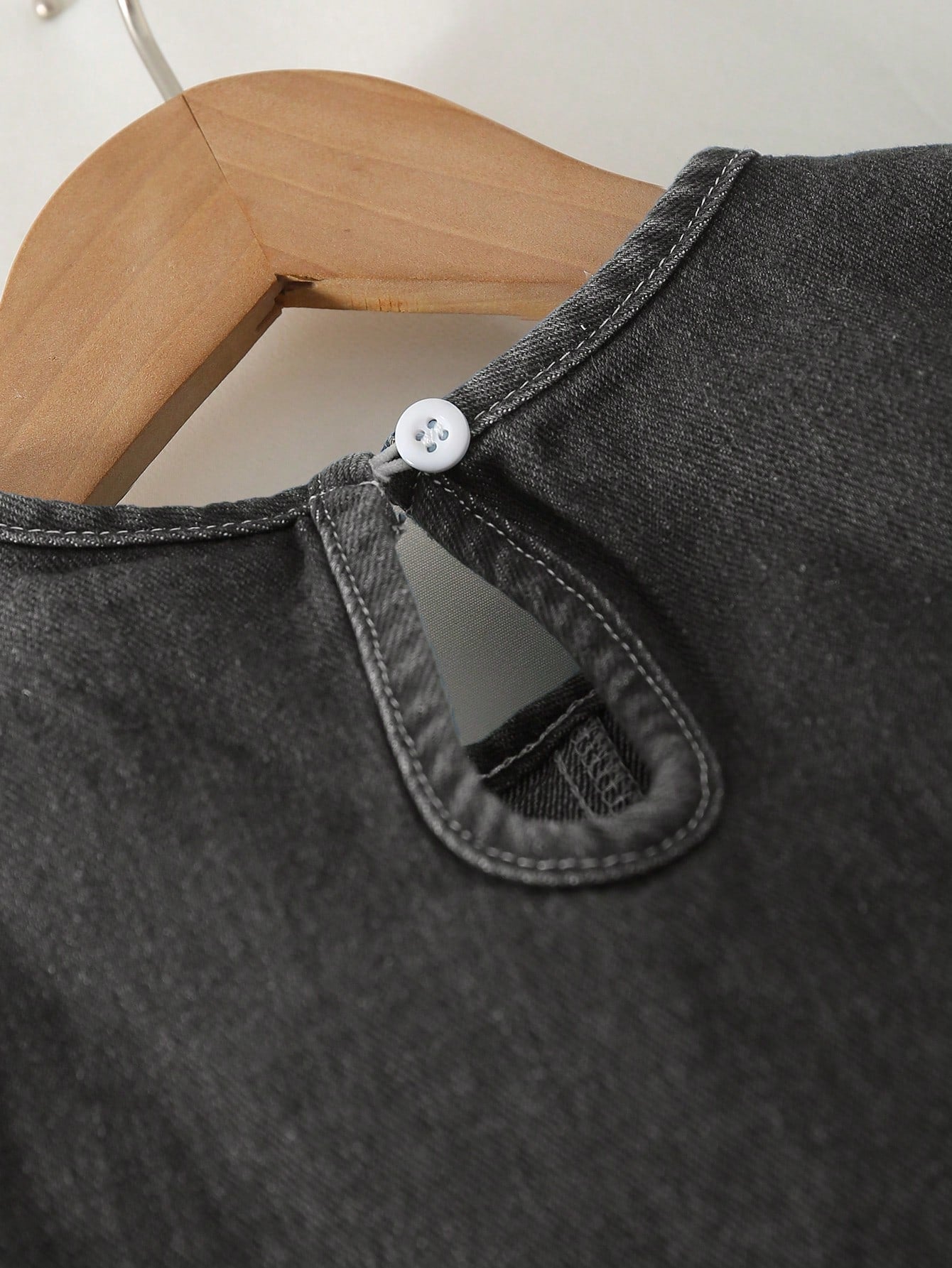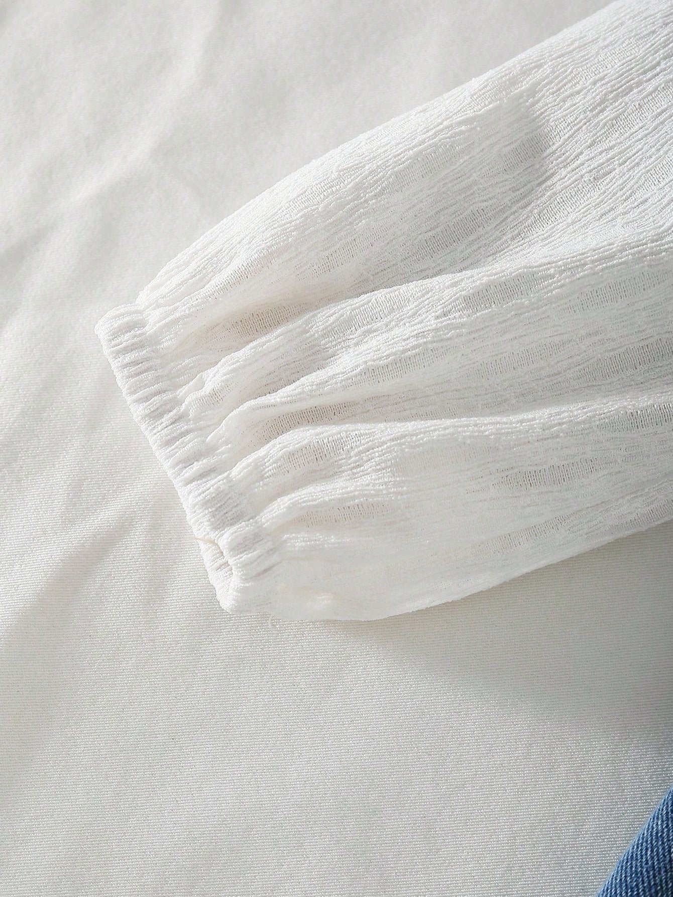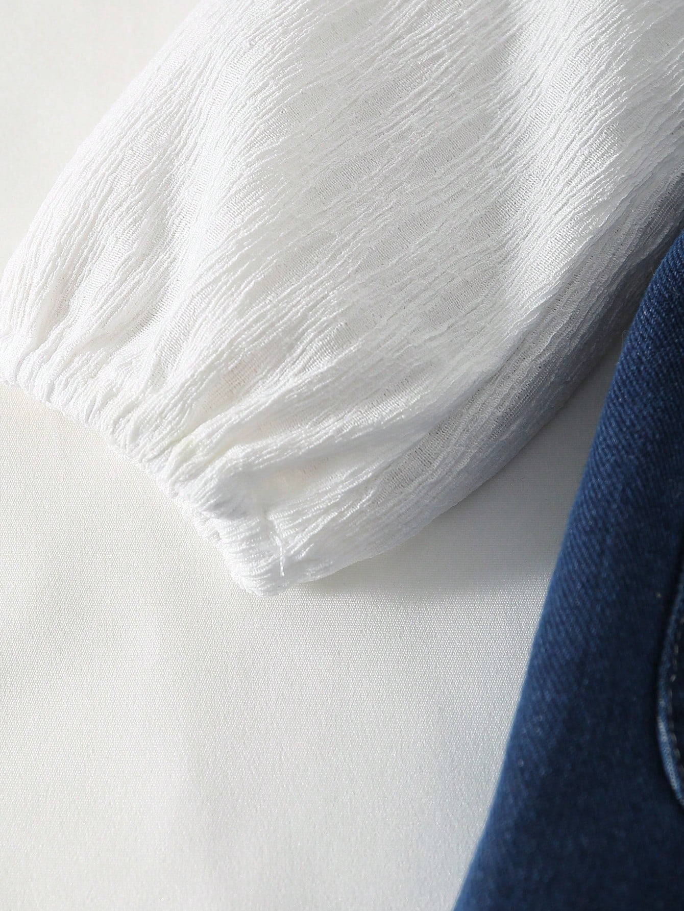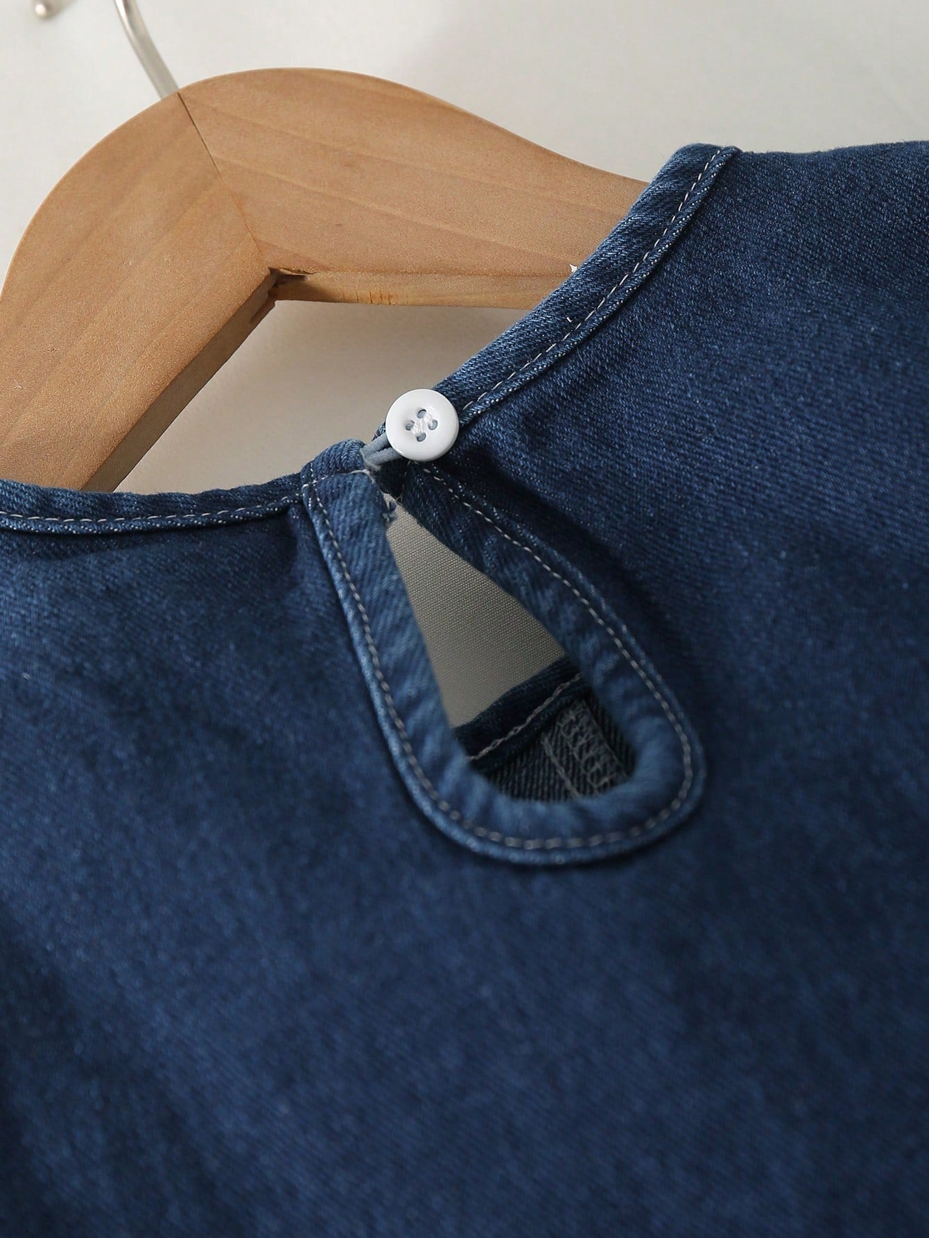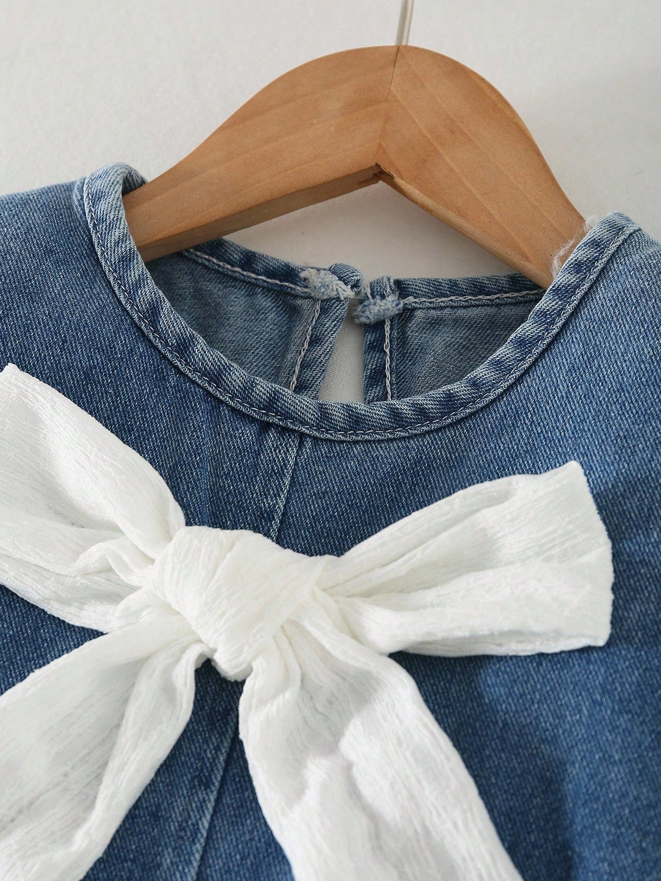 Vestido vaquero para niñas con decoración de lazo, mangas de patchwork, estilo casual y lindo, adecuado para primavera, verano, vacaciones, vuelta al colegio, todo el año